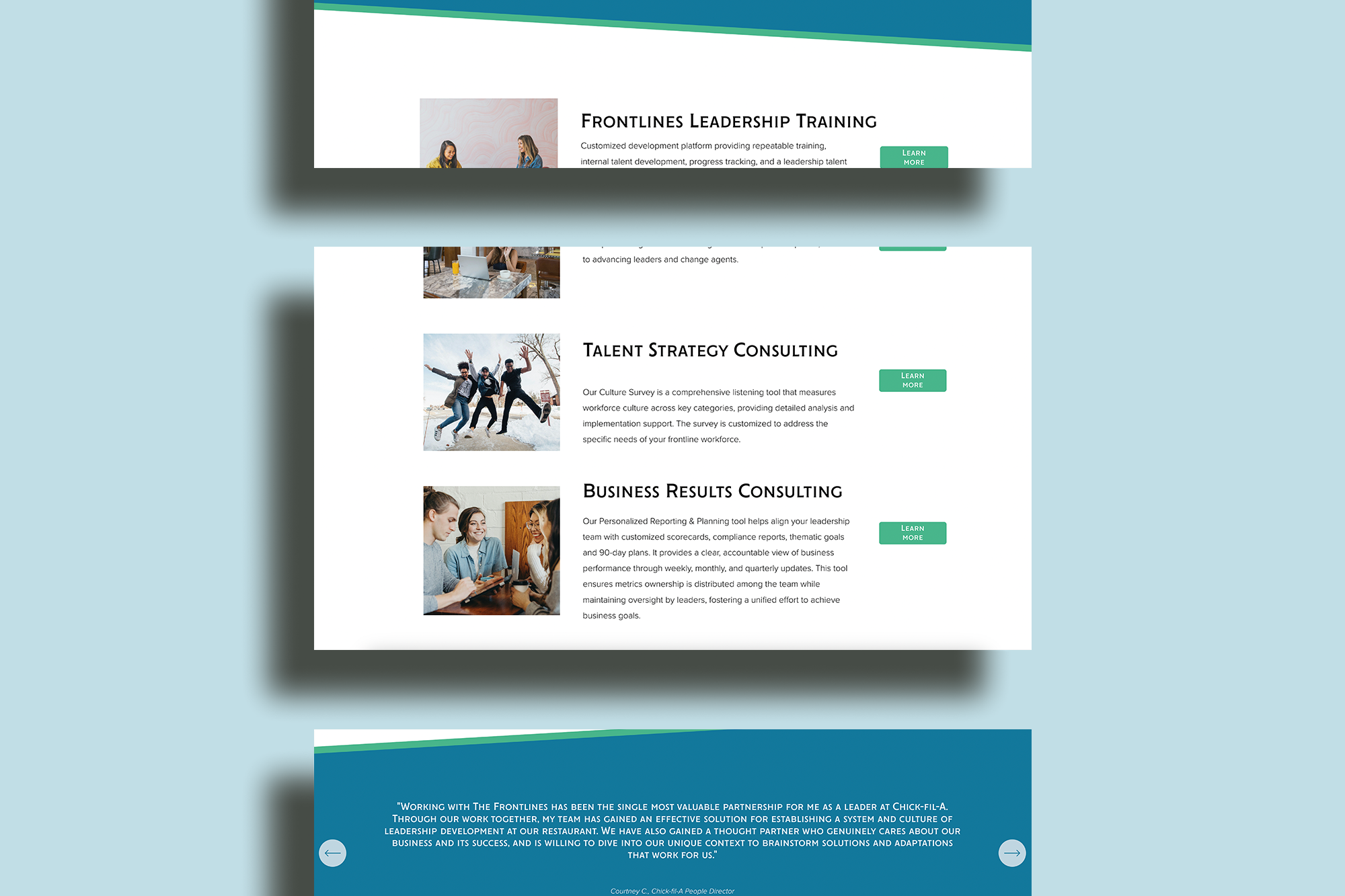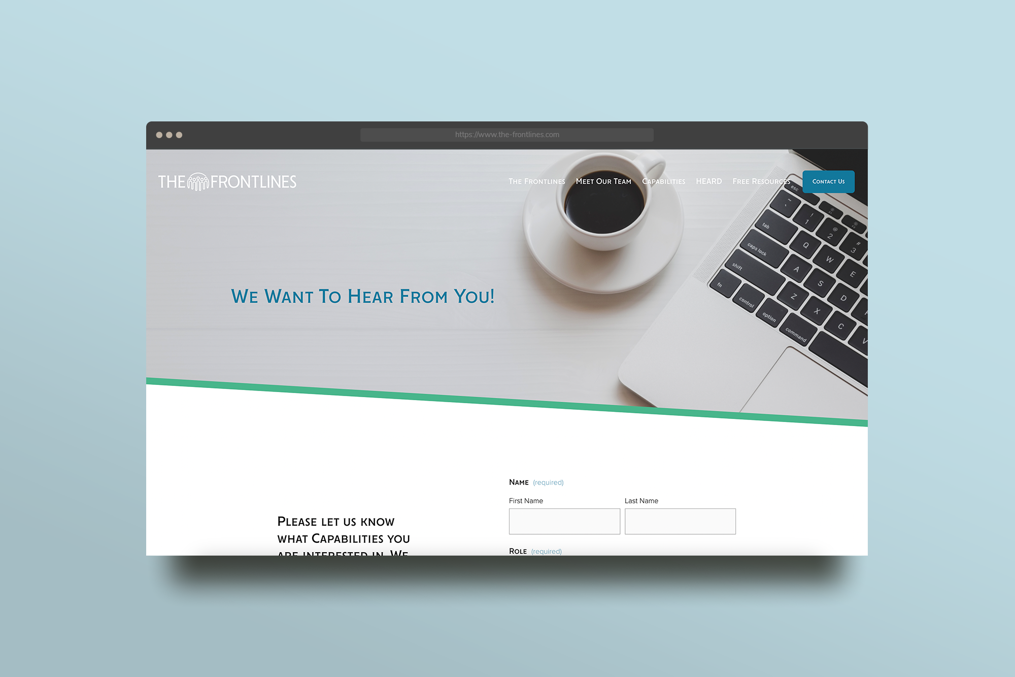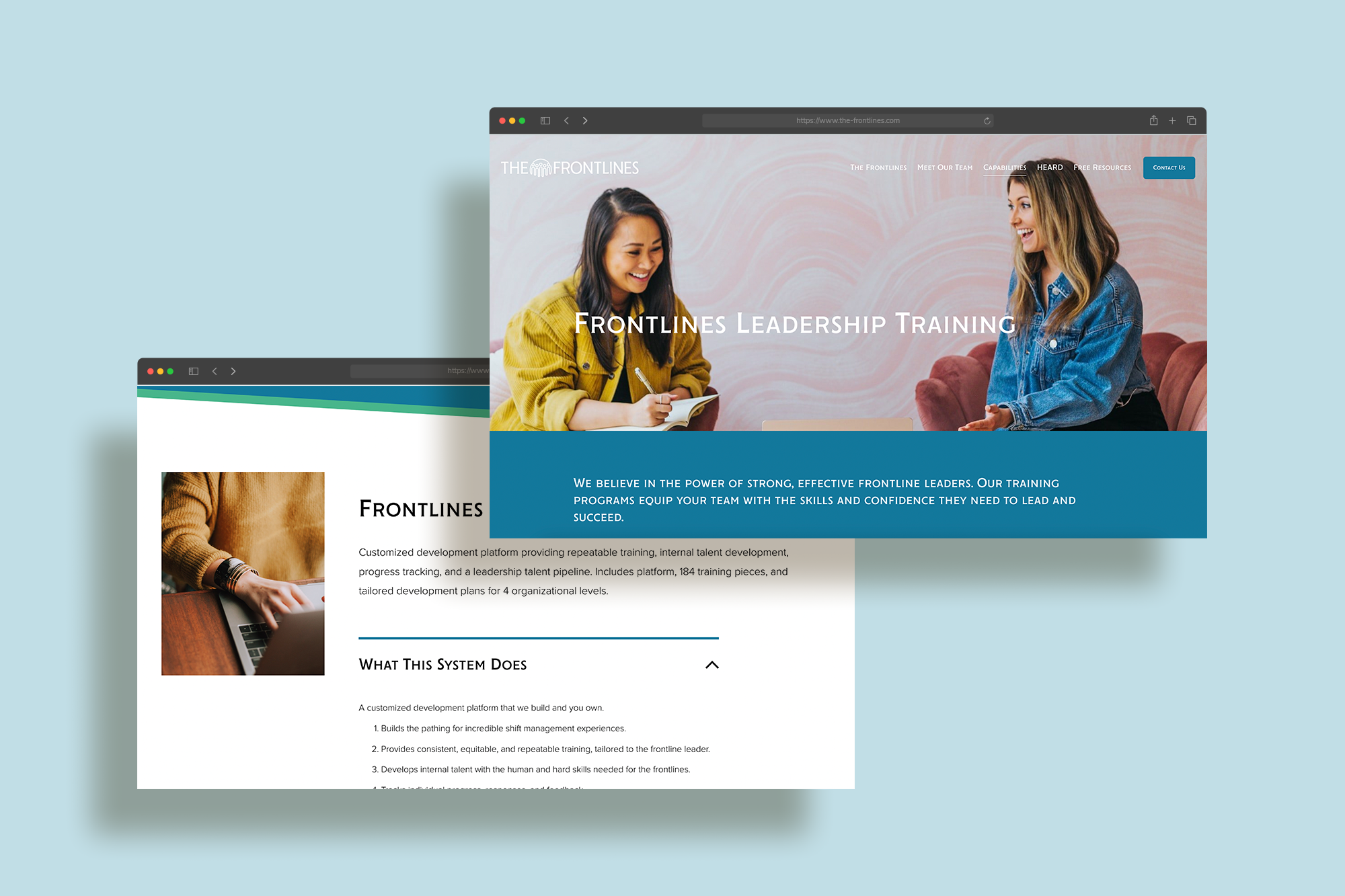 The organization serves frontline workers and wanted their brand identity to be approachable and welcoming. We used bright, cheerful colors and light, clear language to share the vision and what is offered. Each capability page is designed in accordian sections to allow for easy scrolling and the ability to dig deeper if the viewer wants to learn more. There is also an opportunity on every page to take the “next step” and contact the team.
